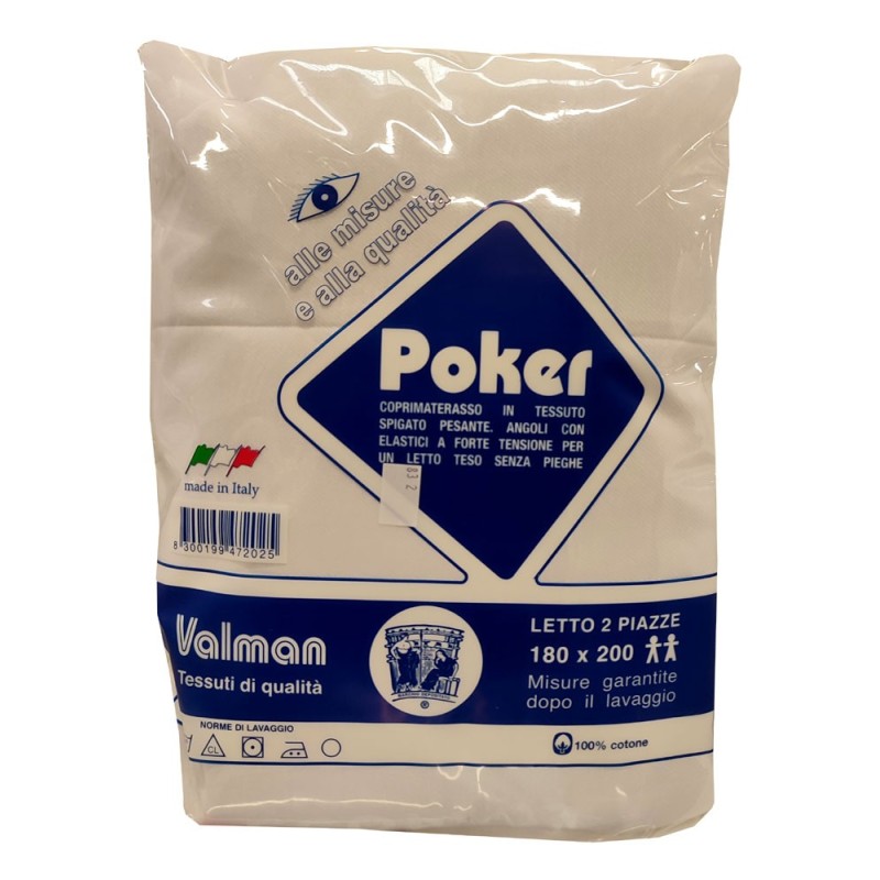 Coprimaterasso fodera con angoli modello Poker da Valman. In tessuto spigato pesante, con angoli, 100% Cotone. Ottimo prodotto Made in Italy, di qualità. Disponibile nelle misure letto singolo / una piazza, una piazza e mezza e matrimoniale / due piazze.