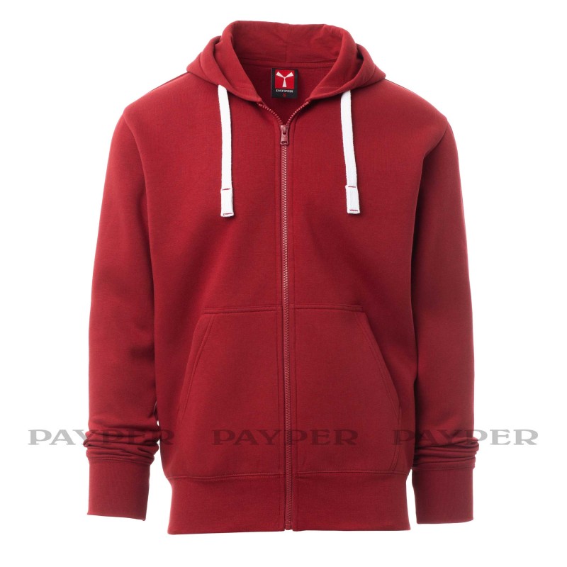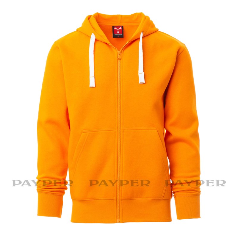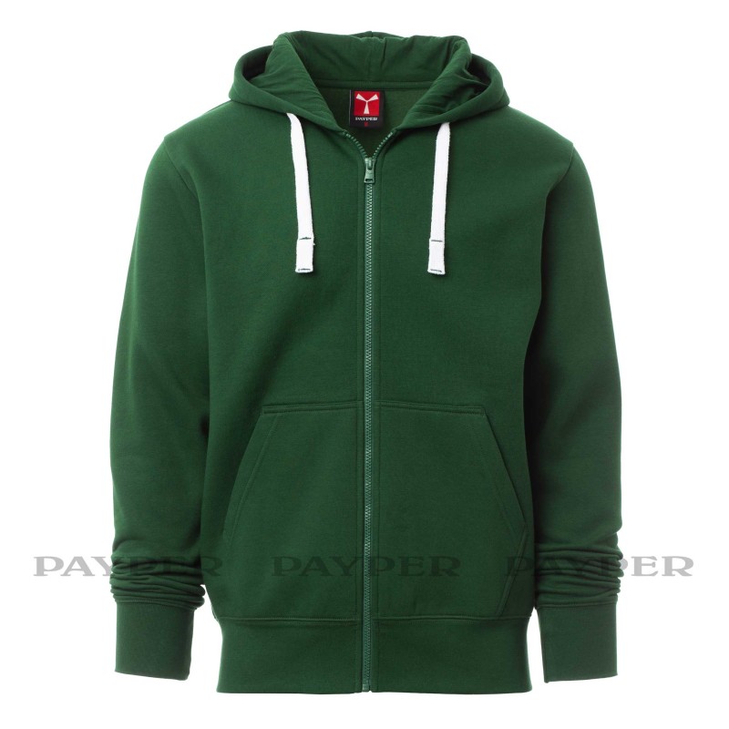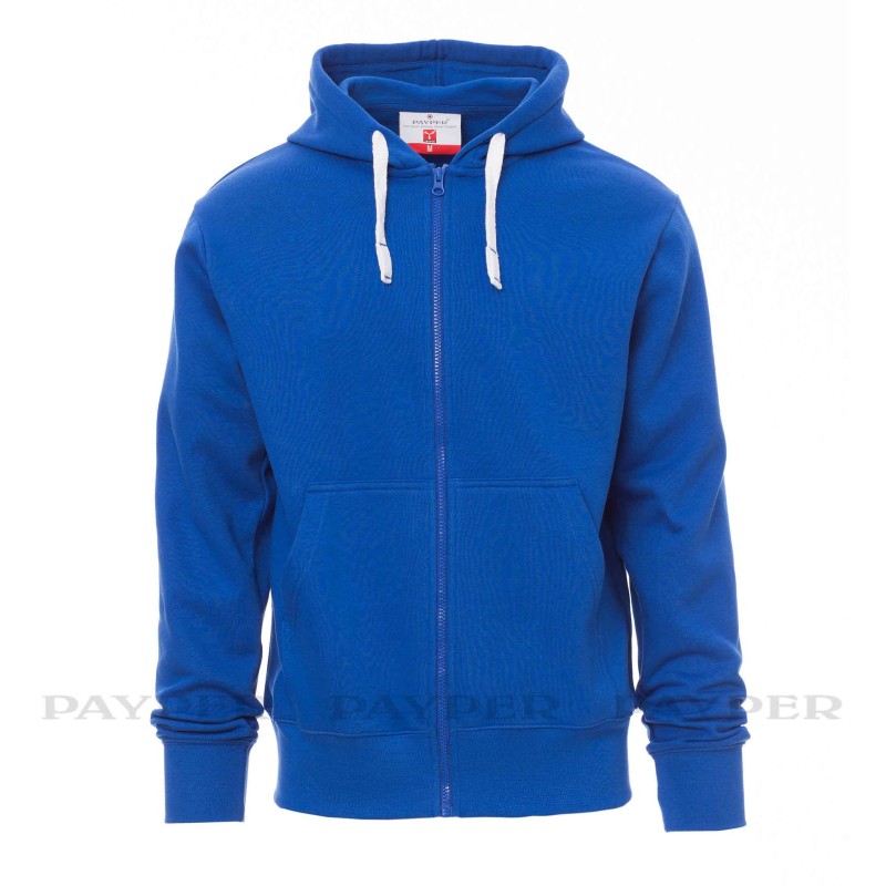 Felpa tecnica garzata da uomo Payper modello Portland, zip intera in plastica a cursore singolo in metallo, cappuccio, coulisse in corda con cuciture in tinta con la felpa, manica a giro, tasche a marsupio, polsini e vita in costina elasticizzata. Cuciture rinforzate, nastro di rinforzo interno collo in tinta. 9 colori, taglie da XS a 5XL.