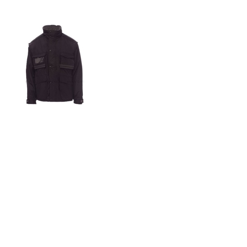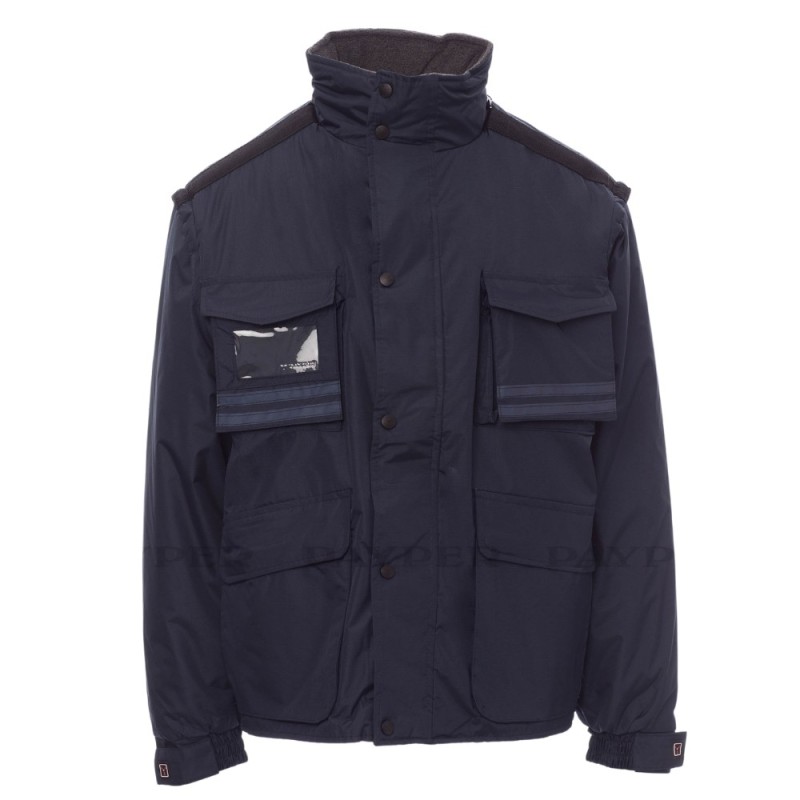 Giubbotto Payper modello Intercontinental da uomo, maniche staccabili, cappuccio richiudibile nel colletto, bande riflettenti in tinta fronte e retro, 5 tasche esterne di cui una porta badge reversibile. Interno imbottito, colletto schiena e scaldareni in micropile, inserti traspiranti sottobraccio, coulisse in vita e zip interna per agevolare stampe e ricami. 2 colori, taglie dalla S alla 3XL.